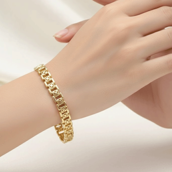 La Pulsera Geométrica Bañada en Oro de 19cm de largo es una pieza moderna y elegante que destaca por su diseño de eslabones rectangulares entrelazados, inspirados en la arquitectura contemporánea. Cada detalle refleja precisión y estilo, logrando una joya sofisticada que aporta un toque de lujo a cualquier look.