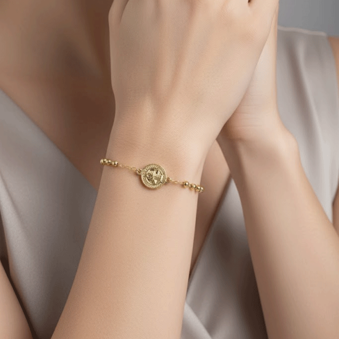Pulsera bañada en oro con medalla de San Benito y crucifijo. Fe, protección y elegancia en una sola joya.