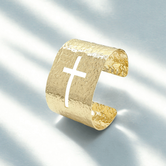 Pulsera tipo caña bañada en oro con acabado martillado y cruz calada, símbolo de elegancia y fe.