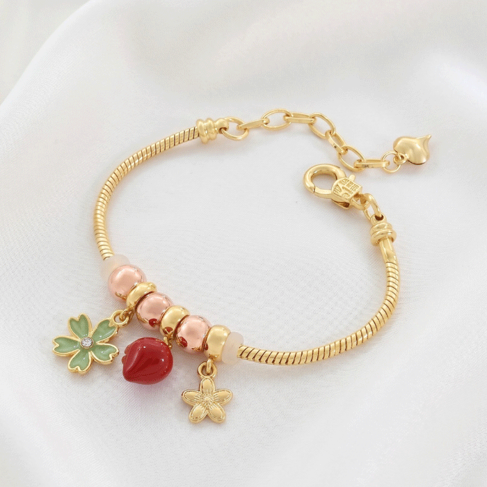 Dale un toque lúdico y elegante a tu colección con nuestra pulsera de diseño temático. Fabricada con una base de cadena de serpiente y un acabado premium en baño de oro, esta pieza destaca por su armoniosa combinación de elementos: una flor verde esmaltada con centro de circón, una flor dorada detallada y una encantadora fresa roja.