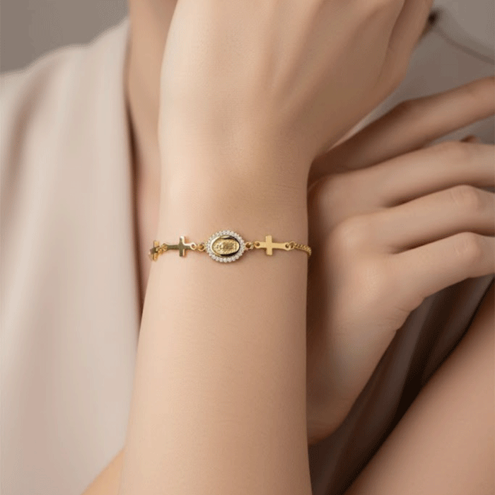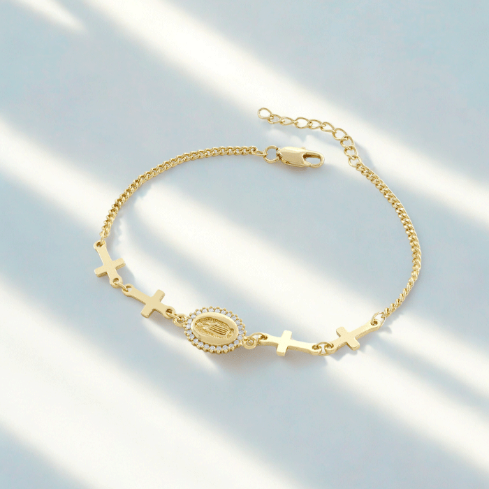 Pulsera bañada en oro con medalla de la Virgen de Guadalupe y cruces. Fe y elegancia en una joya única.