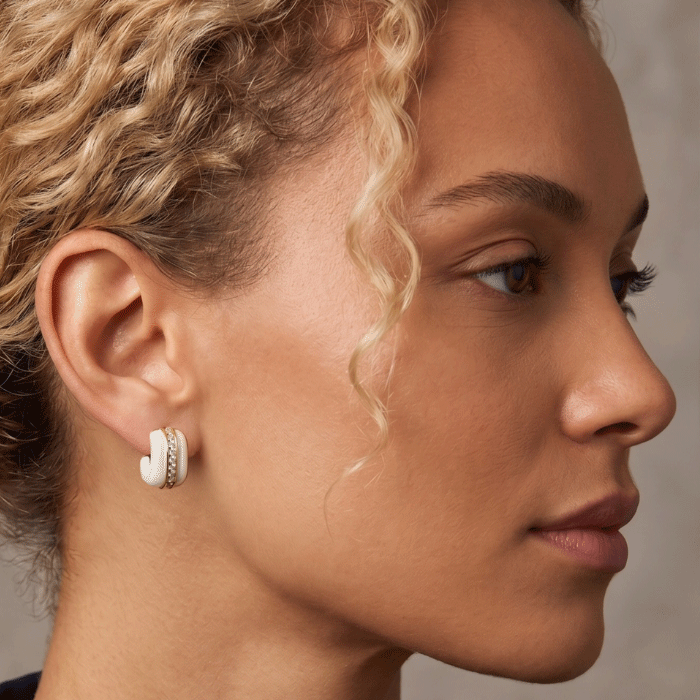 Estas sofisticadas semi argollas combinan la pureza de la resina blanca con el lujo del oro. Su diseño ancho presenta una franja central de circones meticulosamente engastados que capturan la luz en cada movimiento.