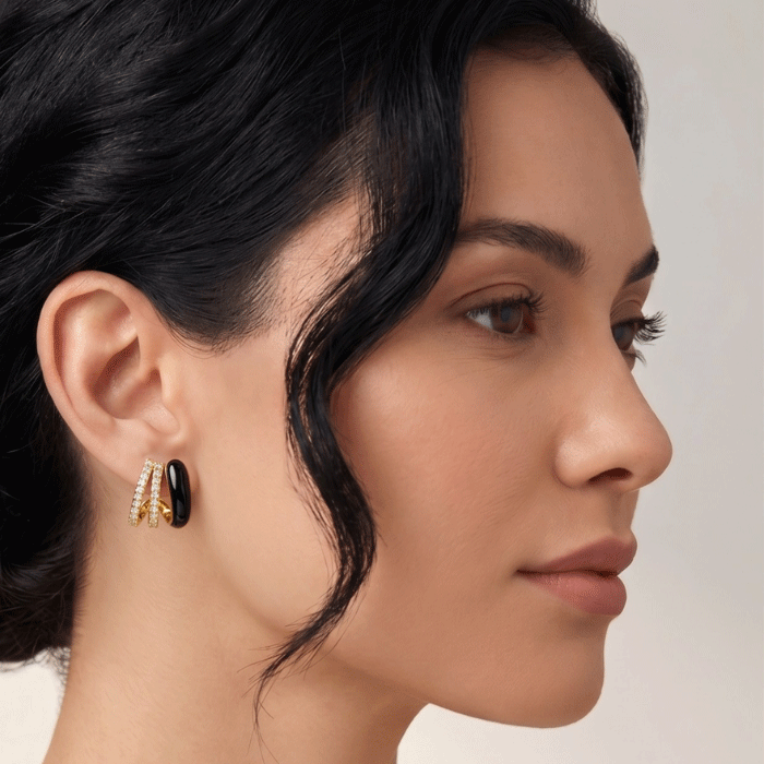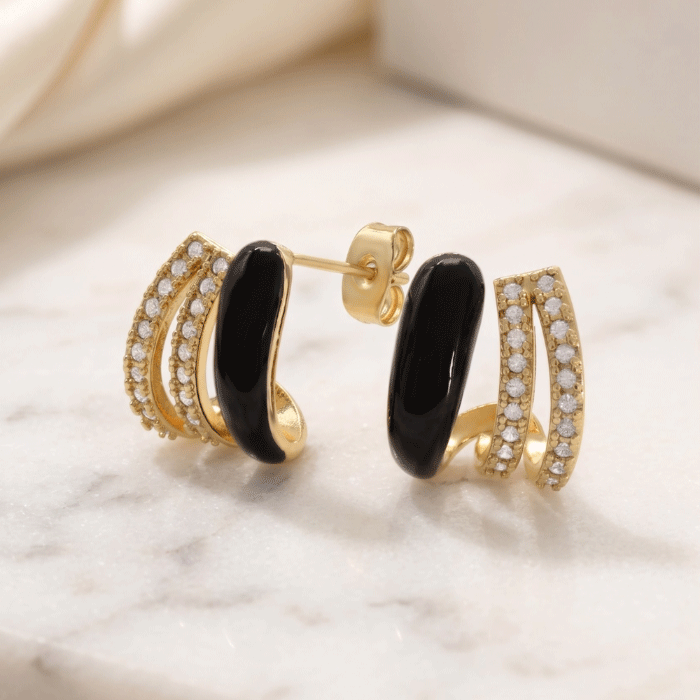 Audaces y sofisticadas. Estas semi argollas presentan un diseño moderno de tres bandas: una central con esmalte negro profundo y dos laterales meticulosamente engastadas con circones brillantes. Un accesorio statement que combina color y lujo en una sola pieza.