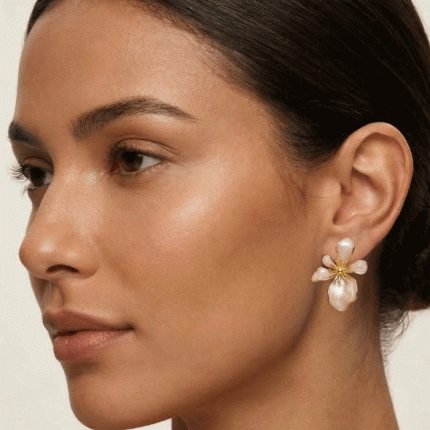 Eleva tu estilo diario con estos exclusivos aretes de diseño floral. Confeccionados con un delicado acabado en baño de oro y pétalos esmaltados en un tono nude con efecto marmoleado.