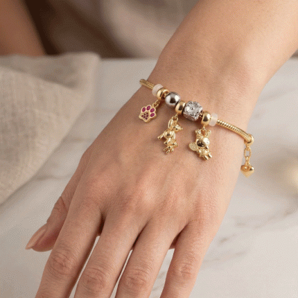 Pulsera de Dijes Bañada en Oro – Diseño de Osito, Conejito y Huella