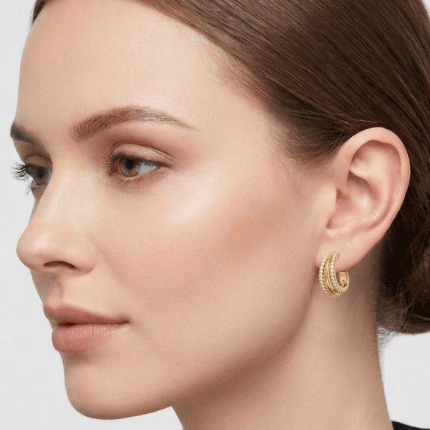 Eleva tu estilo cotidiano con estas sofisticadas semi argollas de triple banda. Con un acabado de lujo en baño de oro y delicados circones incrustados a mano, son la pieza perfecta para quienes buscan un brillo sutil pero impactante.