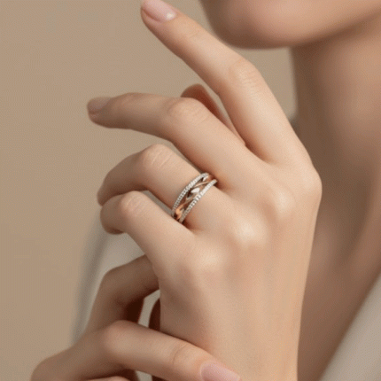 Anillo trenzado con doble borde de circones brillantes, bañado en Oro Italiano 24KT y detalle en Oro Blanco. Elegante, moderno y lleno de significado.